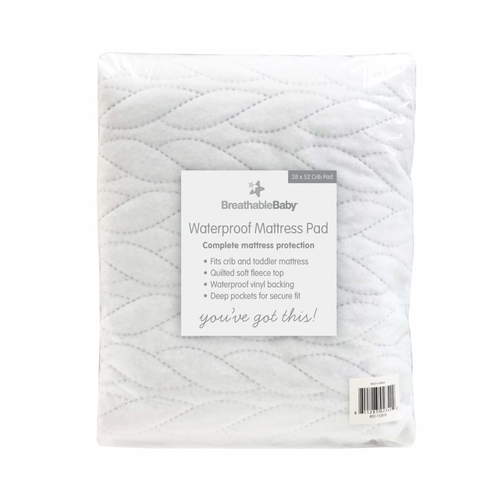Comfortable, quilted softness with a waterproof barrier makes BreathableBaby the top choice for baby’s crib. The quilted, soft fleece top offers breathable softness with just the right amount of cushioning for safe use with newborns, while the deep pockets create a secure fit around your mattress. A 100% waterproof barrier helps protect baby’s mattress from leaky messes, stains and wetness, plus this crib mattress pad is machine washable and dryer friendly for easy cleaning convenience for moms and dads. Fits standard crib and toddler mattresses.